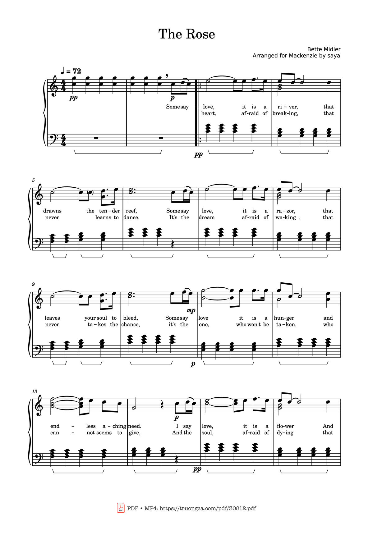 The Videos/audios The Rose Piano by Bette Midler were embed from Youtube, Musescore or the other 3rd links. Videos are subject to 3rd's copyright control and may be removed by YouTube's copyright rules and 3rd's policies or maybe included advertisements. If you cannot access to these videos/audios, this mean that have been removed.