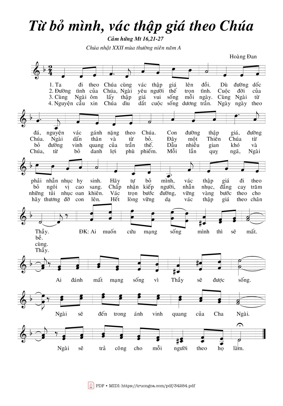 Transposition is the process of moving a song's melody and chords up or down in pitch by a constant interval. The direction of the transposition tool is indicated by a plus (+) sign for up and a minus (-) sign for down. Hover mouse over chords signs to see the chords chart of Từ Bỏ Mình Vác Thập Giá Theo Chúa song.