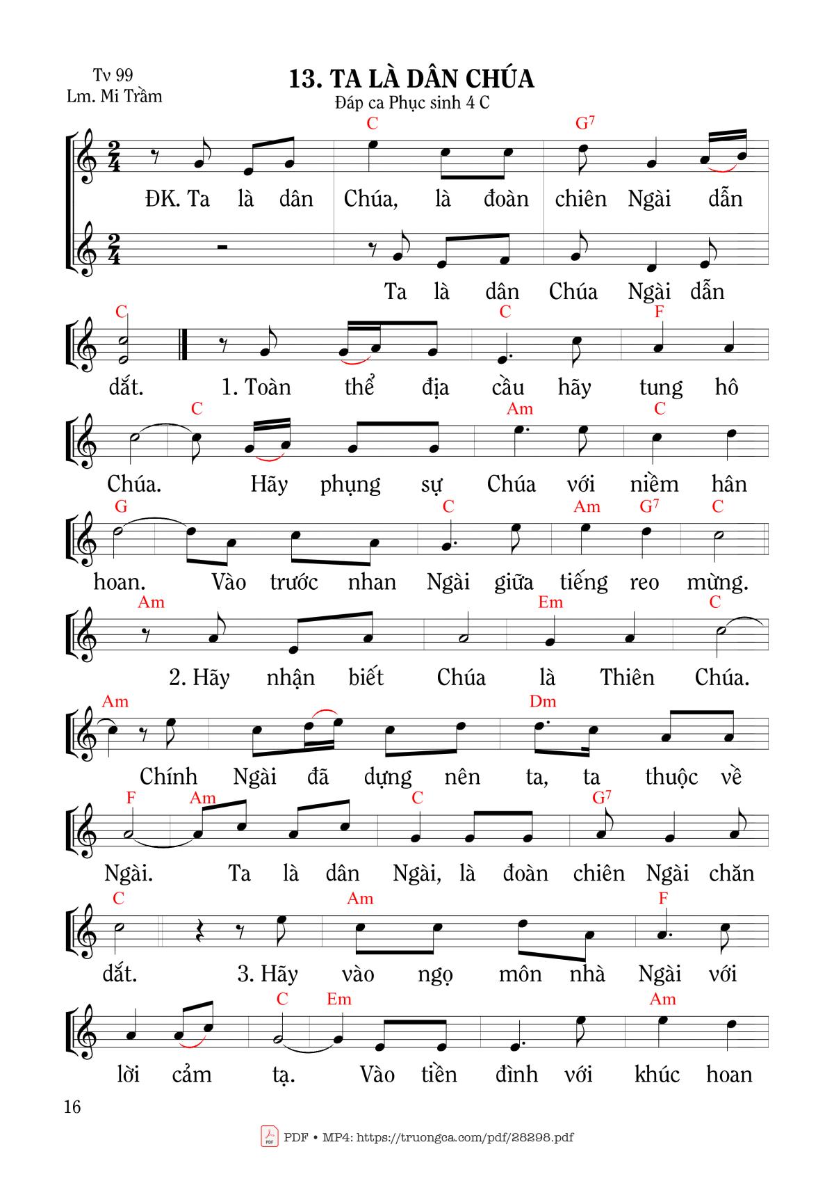 The Videos/audios Thánh Vịnh 99, Ta Là Dân Chúa by Mi Trầm were embed from Youtube, Musescore or the other 3rd links. Videos are subject to 3rd's copyright control and may be removed by YouTube's copyright rules and 3rd's policies or maybe included advertisements. If you cannot access to these songs, this mean that have been removed.