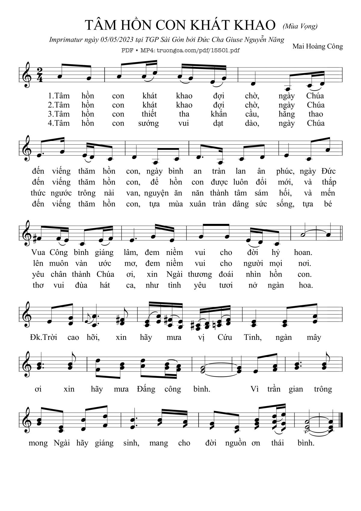 Điệp khúc. Trời cao hỡi, xin hãy mưa vị cứu tinh, ngàn mây ơi xin hãy mưa Đấng công bình. Vì trần gian trông mong ngài hãy giáng sinh, mang cho đời nguồn ơn thái bình.