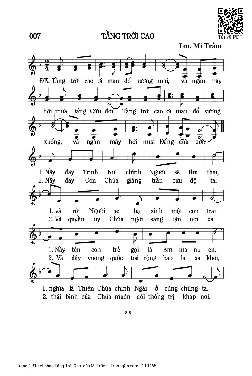 Tầng trời cao ơi mau đổ sương mai, và ngàn mây hỡi mưa Đấng Cứu đời. Tầng trời cao ơi mau đổ sương xuống, và ngàn mây hỡi mưa Đấng Cứu đời.