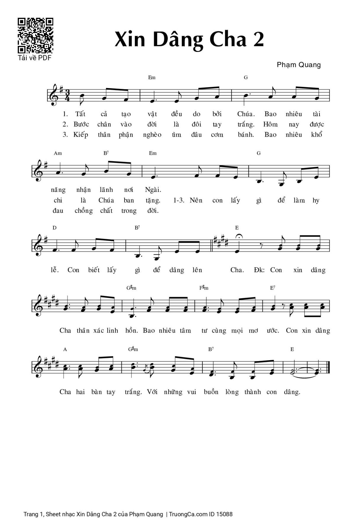 Điệp khúc. Con xin dâng Cha thân xác linh hồn, bao nhiêu tâm tư cùng mọi mơ ước. Con xin dâng Cha hai bàn tay trắng, với những vui buồn lòng thành con dâng.