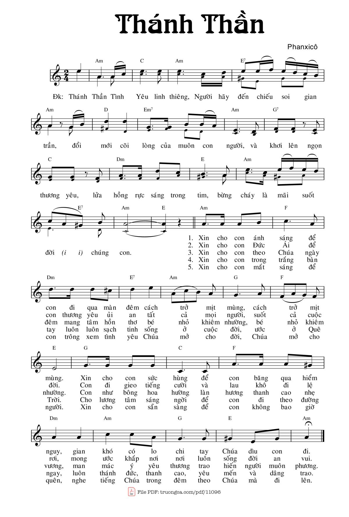 Điệp khúc. Thánh Thần Tình Yêu linh thiêng, Người hãy đến chiếu soi gian trần, đổi mới cõi lòng của muôn con người, và khơi lên ngọn thương yêu, lửa hồng rực sáng trong tim, bừng cháy là mãi suốt đời (i i) chúng con.