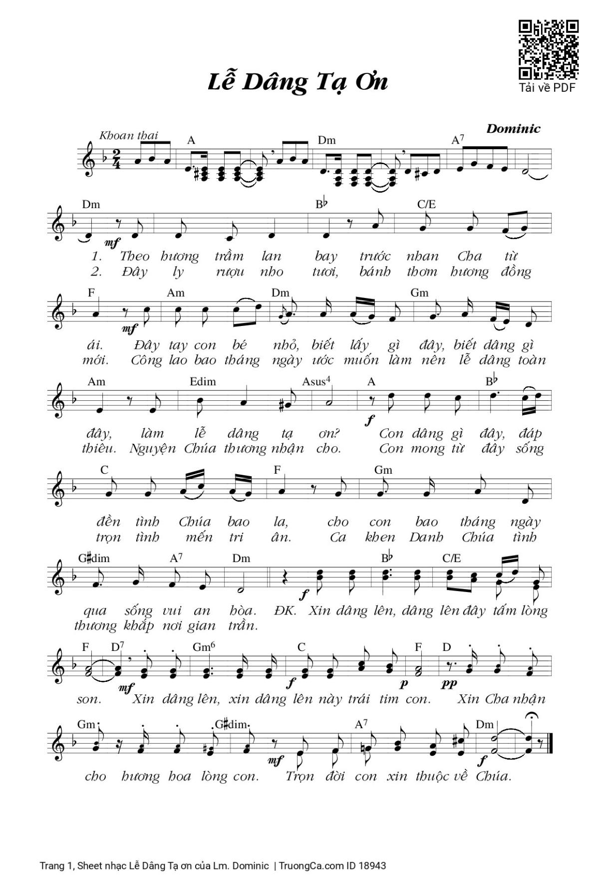 Transposition is the process of moving a song's melody and chords up or down in pitch by a constant interval. The direction of the transposition tool is indicated by a plus (+) sign for up and a minus (-) sign for down. Hover mouse over chords signs to see the chords chart of Lễ Dâng Tạ ơn song.