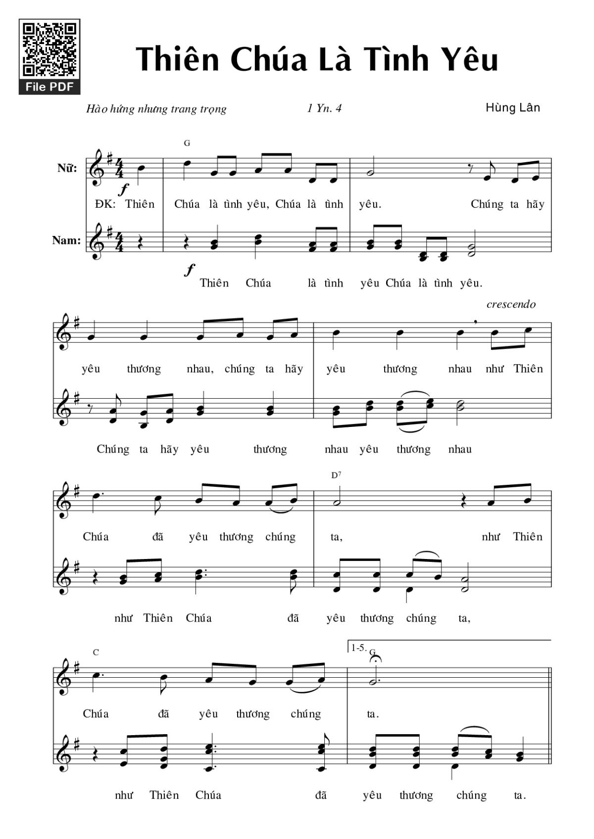 Điệp khúc: Thiên Chúa là Tình yêu, Chúa là Tình yêu, chúng ta hãy yêu thương nhau, chúng ta hãy yêu thương nhau, như Thiên Chúa đã yêu thương chúng ta, như Thiên Chúa đã yêu thương chúng ta. (Thiên Chúa là Tình yêu là Tình yêu).