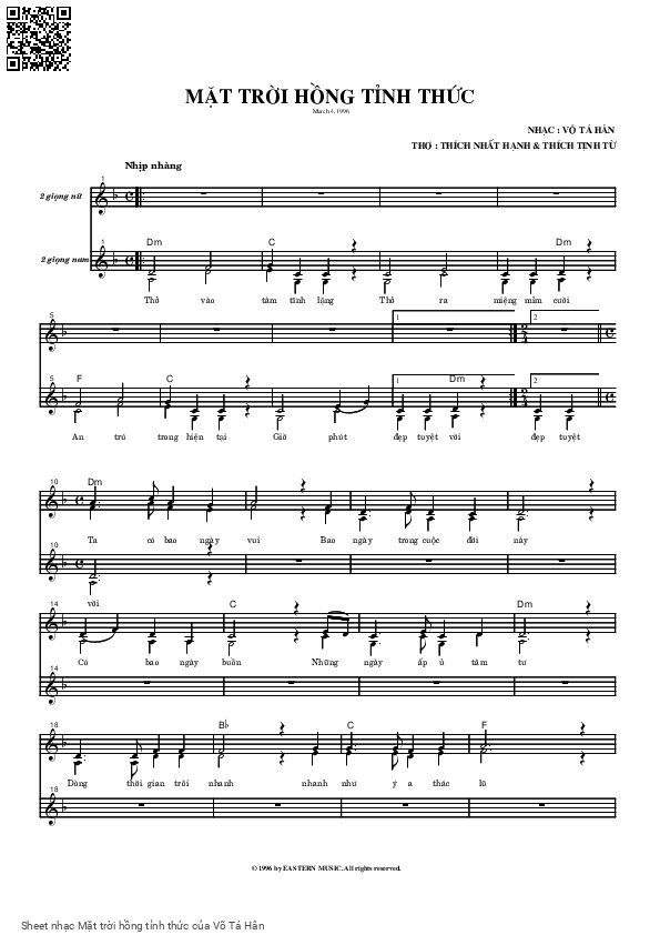 Võ Tá Hân Thở vào tâm tĩnh lặng Thở ra miệng mỉm cười [PDF] [Sheet] [Lyrics] [Mp4/Midi]
