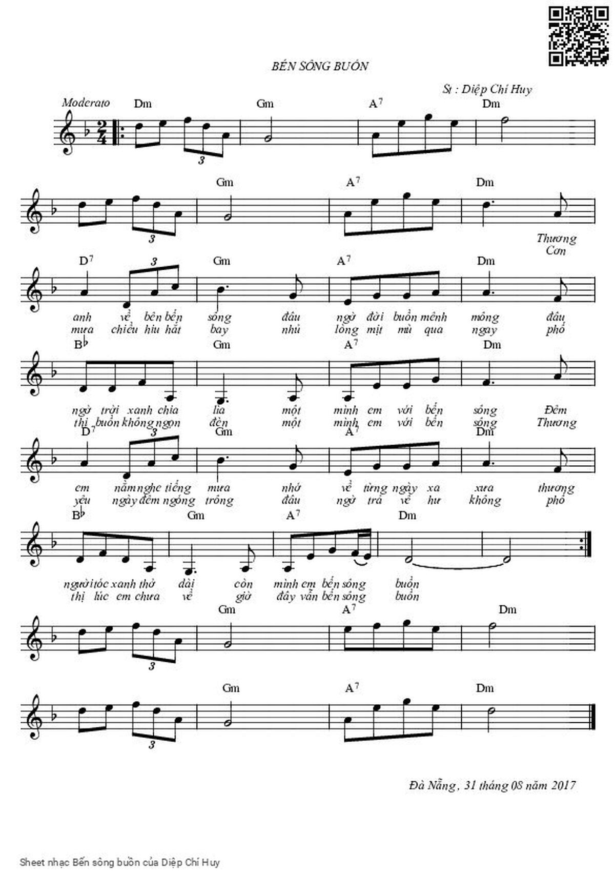 Transposition is the process of moving a song's melody and chords up or down in pitch by a constant interval. The direction of the transposition tool is indicated by a plus (+) sign for up and a minus (-) sign for down. Hover mouse over chords signs to see the chords chart of Bến sông buồn song.