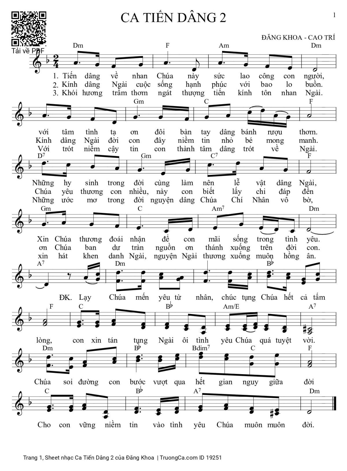Transposition is the process of moving a song's melody and chords up or down in pitch by a constant interval. The direction of the transposition tool is indicated by a plus (+) sign for up and a minus (-) sign for down. Hover mouse over chords signs to see the chords chart of Ca Tiến Dâng 2 song.