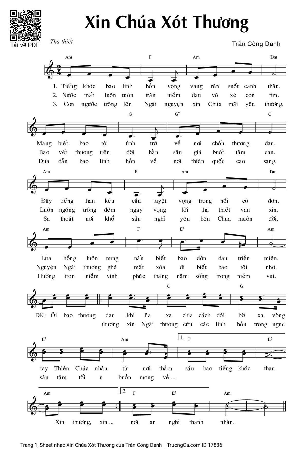 Transposition is the process of moving a song's melody and chords up or down in pitch by a constant interval. The direction of the transposition tool is indicated by a plus (+) sign for up and a minus (-) sign for down. Hover mouse over chords signs to see the chords chart of Xin Chúa Xót Thương song.