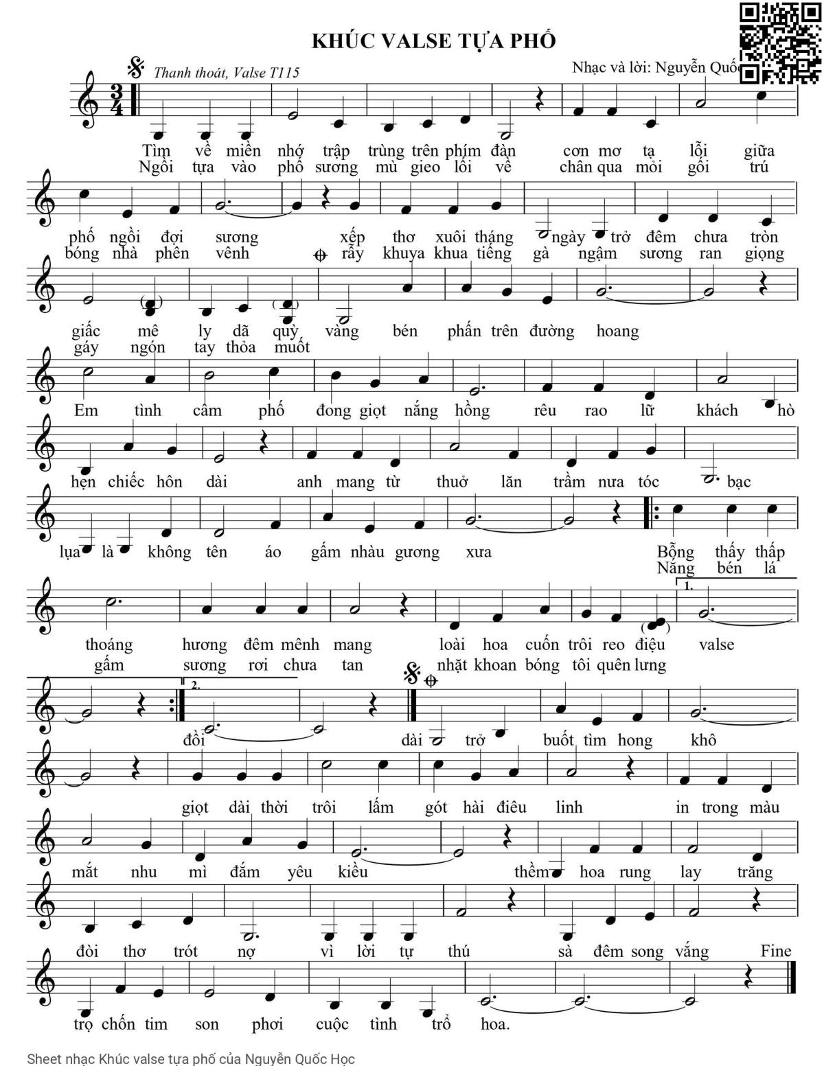 The Videos/audios Khúc valse tựa phố by Nguyễn Quốc Học were embed from Youtube, Musescore or the other 3rd links. Videos are subject to 3rd's copyright control and may be removed by YouTube's copyright rules and 3rd's policies or maybe included advertisements. If you cannot access to these songs, this mean that have been removed.