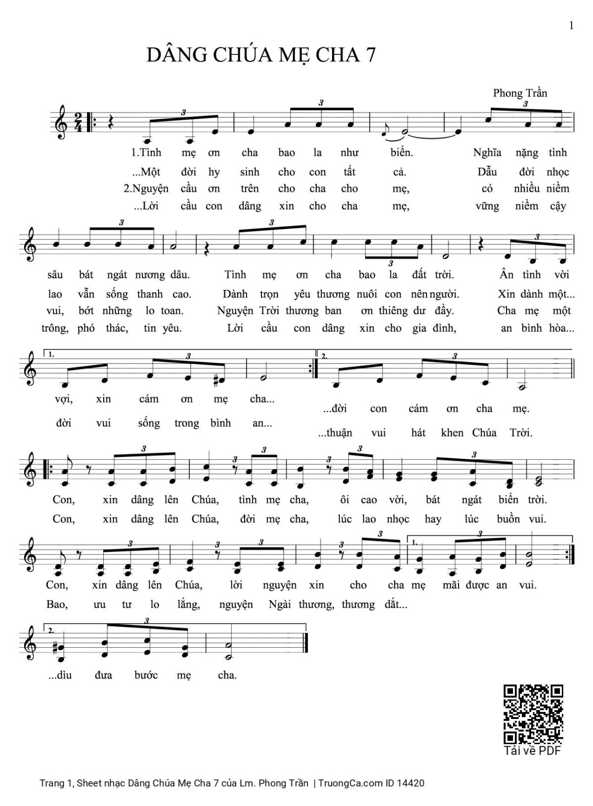 Điệp khúc. Con, xin dâng lên Chúa , tình mẹ cha, ôi cao vời, bát ngát biển trời. Con, xin dâng lên Chúa, lời nguyện xin cho cha mẹ mãi được an vui. Con, xin dâng lên Chúa, đời mẹ cha, lúc lao nhọc hay lúc buồn vui. Bao, ưu tư lo lắng, nguyện Ngài thương, thương dắt dìu đưa bước mẹ cha.