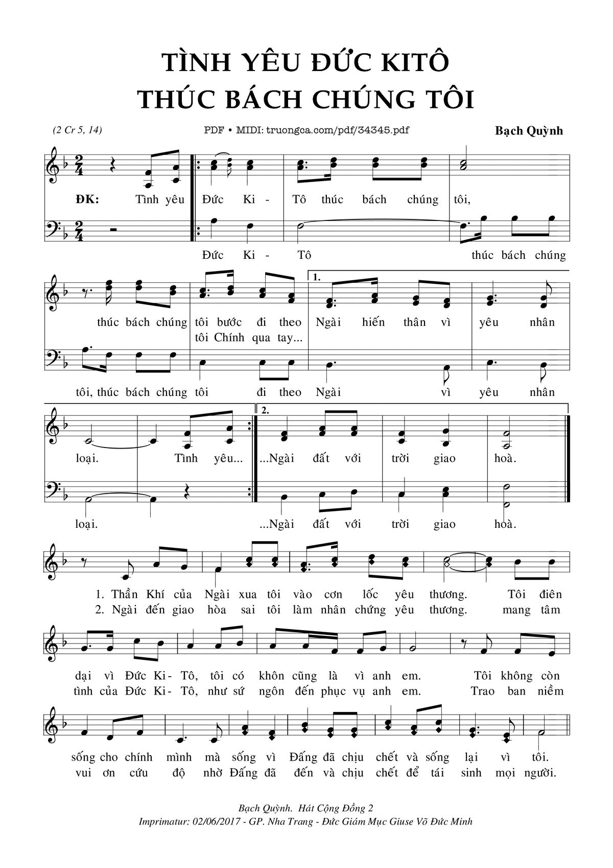 Bạch Quỳnh Tình yêu Đức Kitô thúc bách chúng tôi thúc bách chúng tôi bước đi theo Ngài hiến thân vì yêu nhân loại [PDF] [Sheet] [Lyrics] [Mp4/Midi]