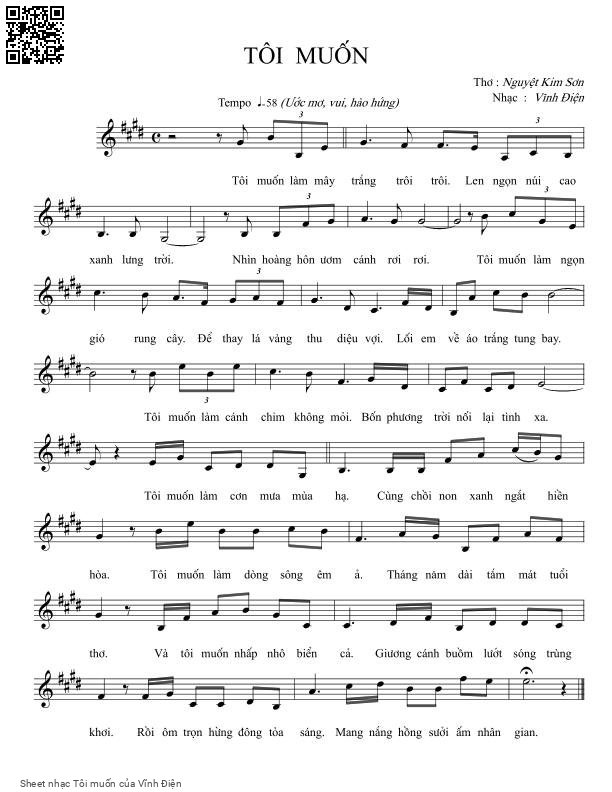 Vĩnh Điện Tôi muốn làm mây trắng trôi Lên ngọn núi cao xanh lưng trời [PDF] [Sheet] [Lyrics] [Mp4/Midi]