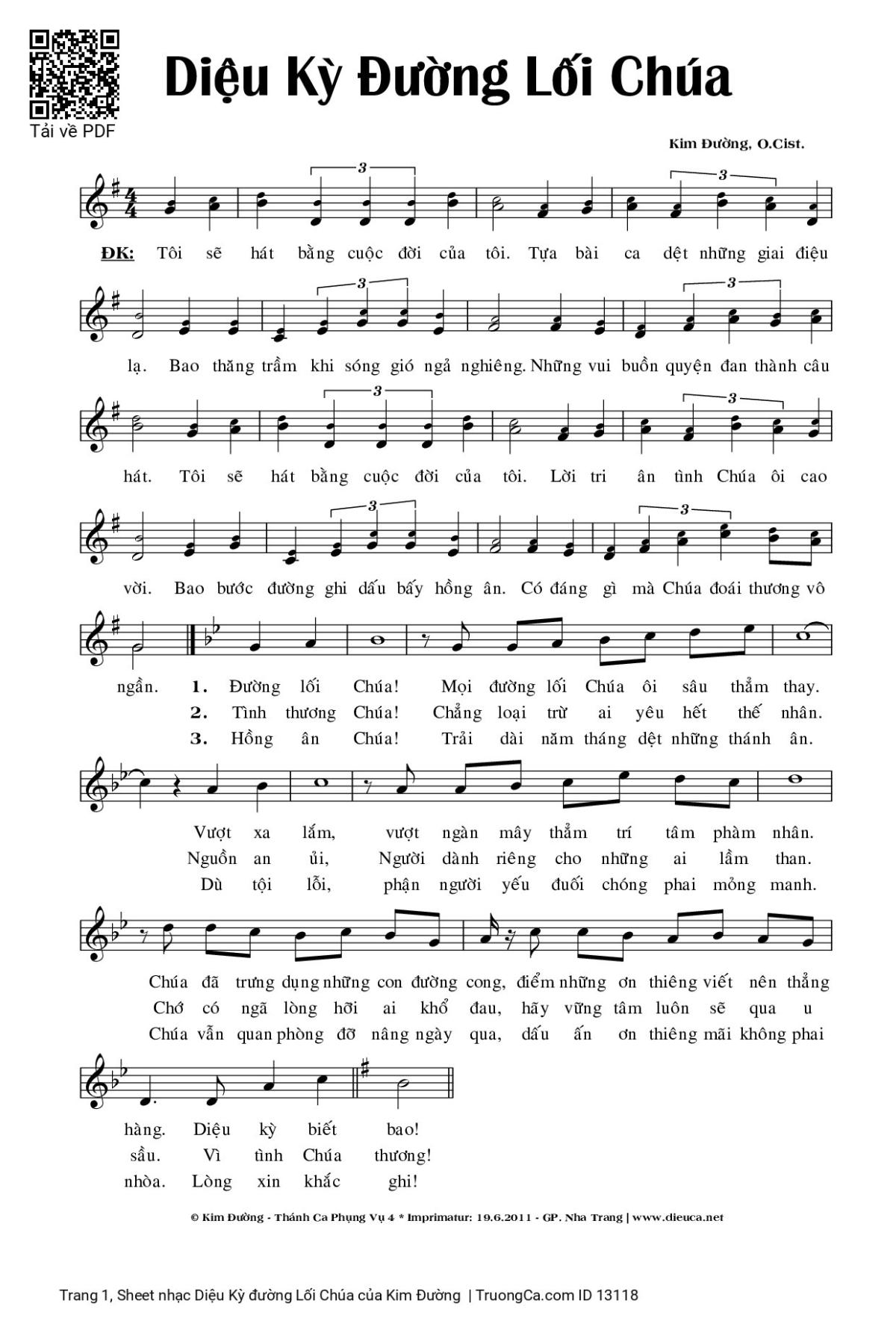 Transposition is the process of moving a song's melody and chords up or down in pitch by a constant interval. The direction of the transposition tool is indicated by a plus (+) sign for up and a minus (-) sign for down. Hover mouse over chords signs to see the chords chart of Diệu Kỳ đường Lối Chúa song.