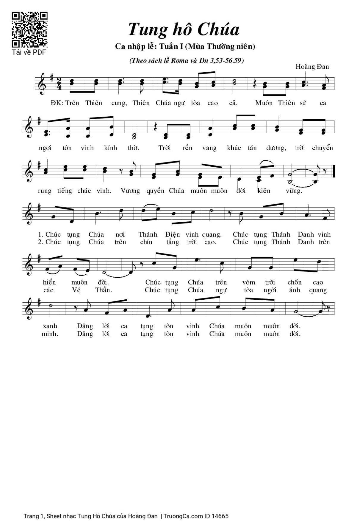 1. Chúc tụng Chúa nơi Thánh Điện vinh quang. Chúc tụng Thánh Danh vinh hiển muôn đời. Chúc tụng Chúa trên vòm trời chốn cao xanh. Dâng lời ca tụng tôn vinh Chúa muôn muôn đời.