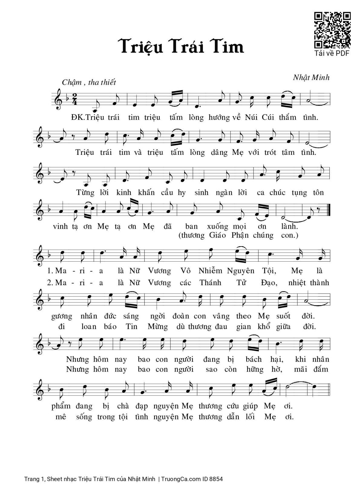 Điệp khúc: Triệu trái tim triệu tấm lòng hướng về Núi Cúi thắm tình. Triệu trái tim và triệu tấm lòng dâng Mẹ với trót tâm tình. Từng lời kinh khấn cầu hy sinh ngàn lời ca chúc tụng tôn vinh tạ ơn Mẹ tạ ơn Mẹ đã ban xuống mọi ơn lành.