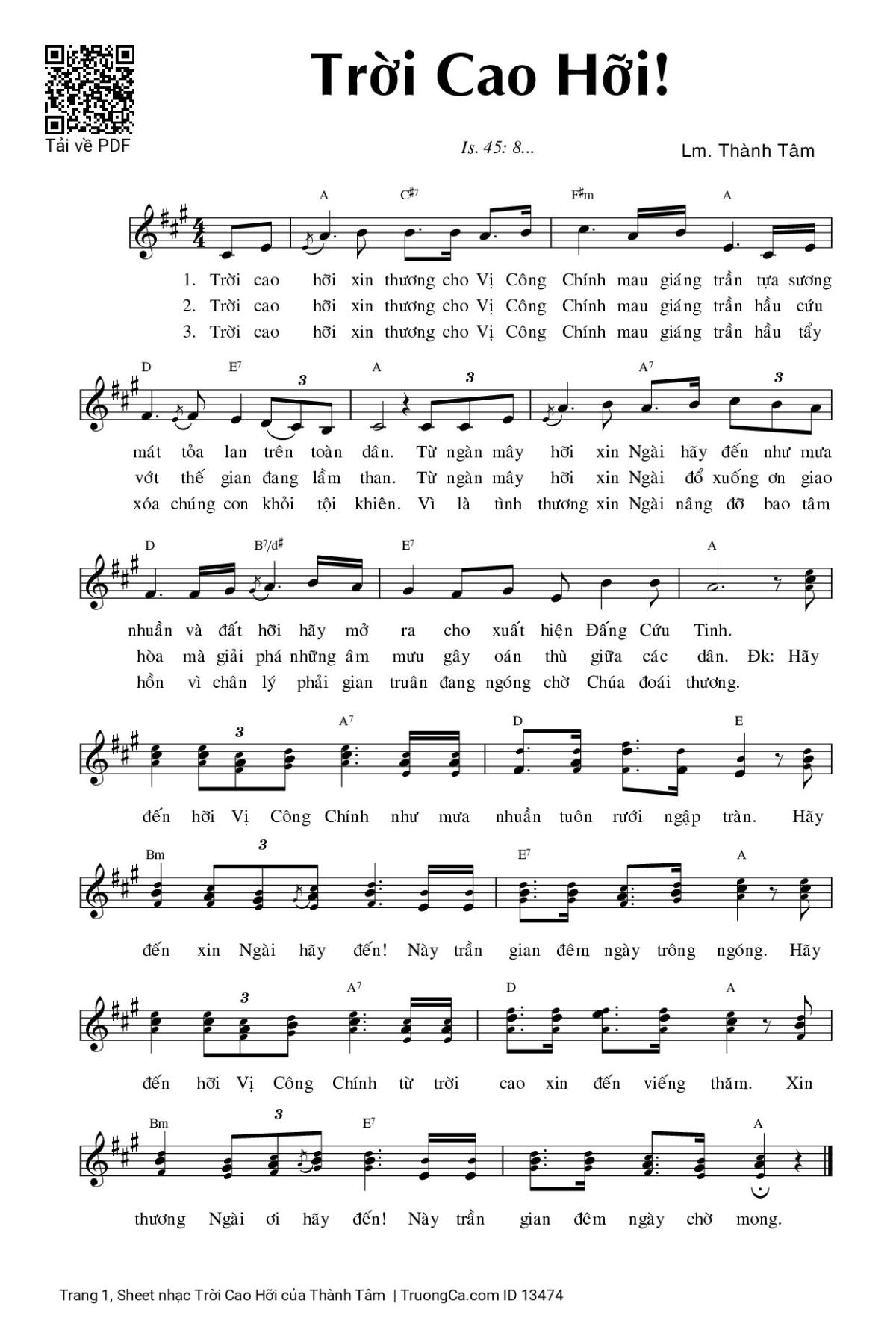 Transposition is the process of moving a song's melody and chords up or down in pitch by a constant interval. The direction of the transposition tool is indicated by a plus (+) sign for up and a minus (-) sign for down. Hover mouse over chords signs to see the chords chart of Trời Cao Hỡi song.