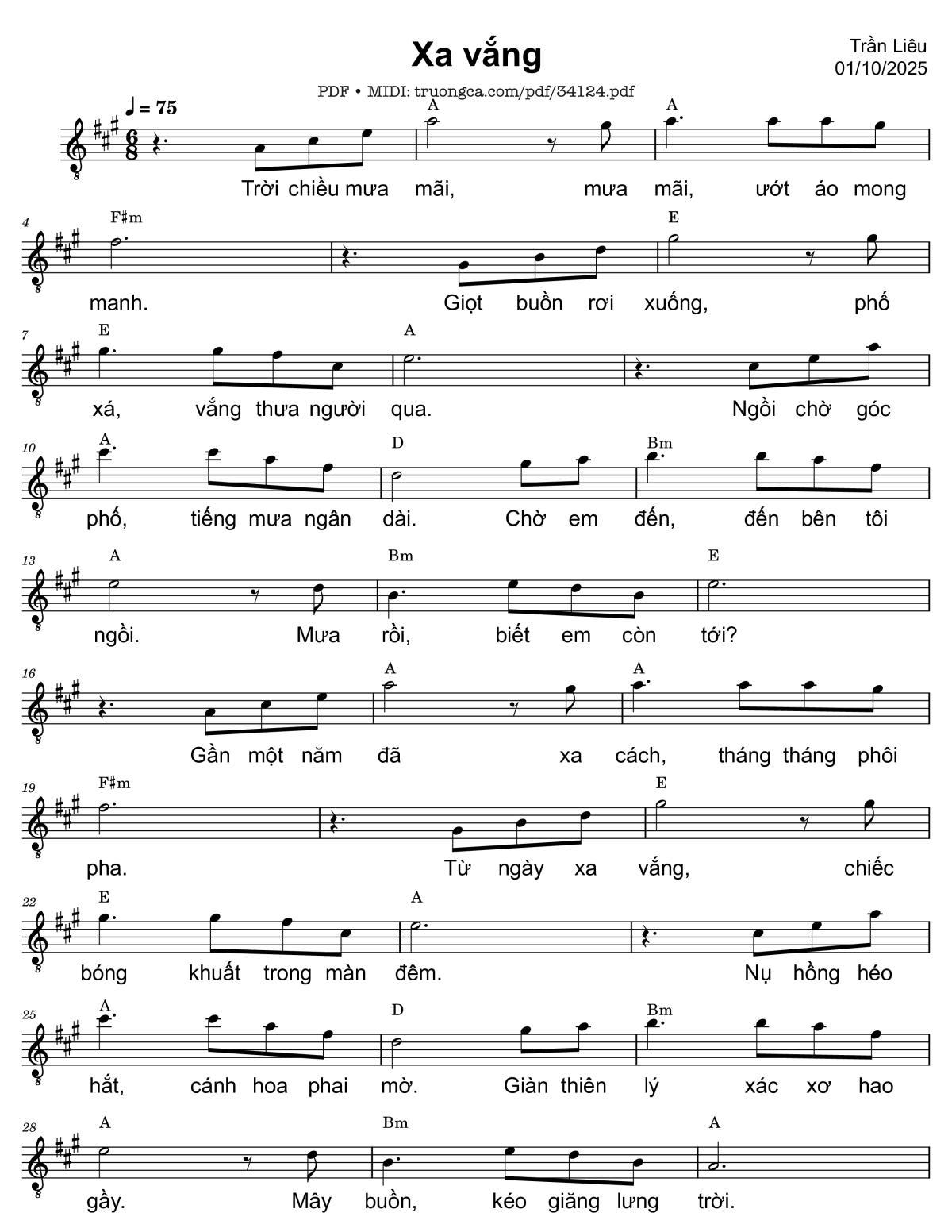 The Videos/audios Xa vắng by Trần Liêu were embed from Youtube, Musescore or the other 3rd links. Videos are subject to 3rd's copyright control and may be removed by YouTube's copyright rules and 3rd's policies or maybe included advertisements. If you cannot access to these songs, this mean that have been removed.