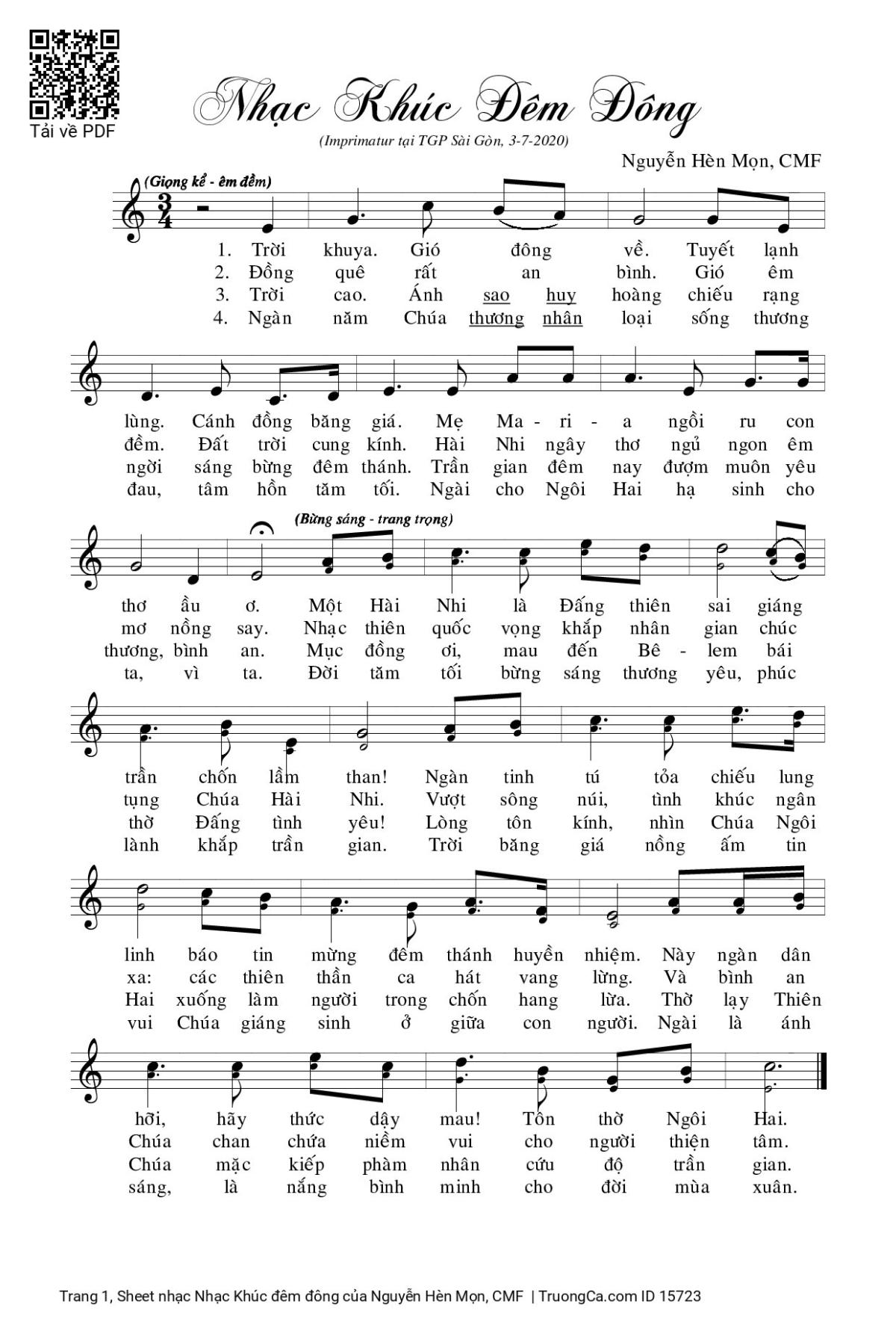 1/ Trời khuya, gió đông về. Tuyết lạnh lùng. Cánh đồng băng giá. Mẹ Maria ngồi ru con thơ ầu ơ. Một Hài Nhi là Đấng Thiên sai giáng trần chốn lầm than. Ngàn tinh tú tỏa chiếu lung linh báo Tin Mừng đêm thánh huyền nhiệm. Này ngàn dân hỡi hãy thức dậy mau tôn thờ Ngôi Hai.