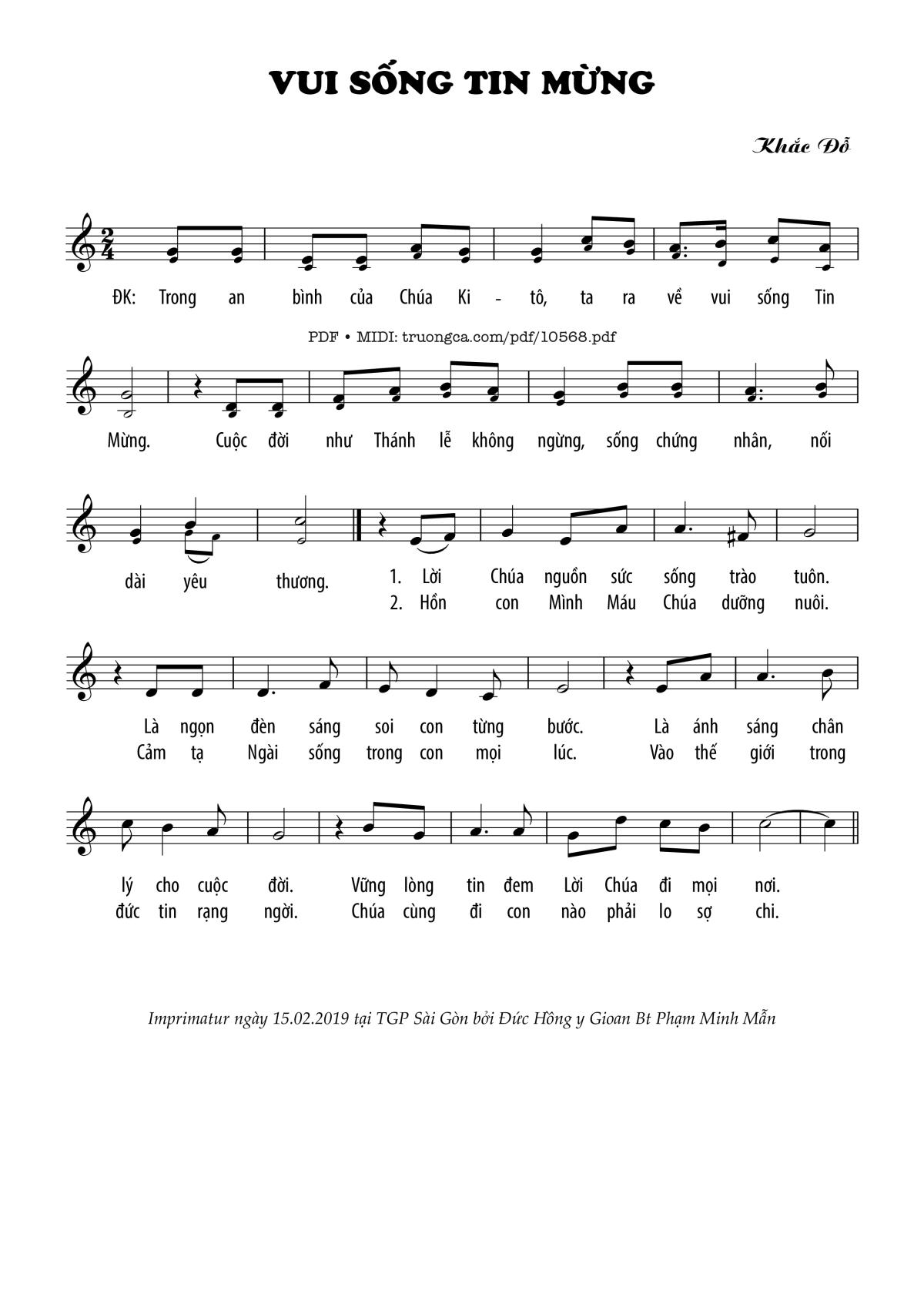 Transposition is the process of moving a song's melody and chords up or down in pitch by a constant interval. The direction of the transposition tool is indicated by a plus (+) sign for up and a minus (-) sign for down. Hover mouse over chords signs to see the chords chart of Vui Sống Tin Mừng song.
