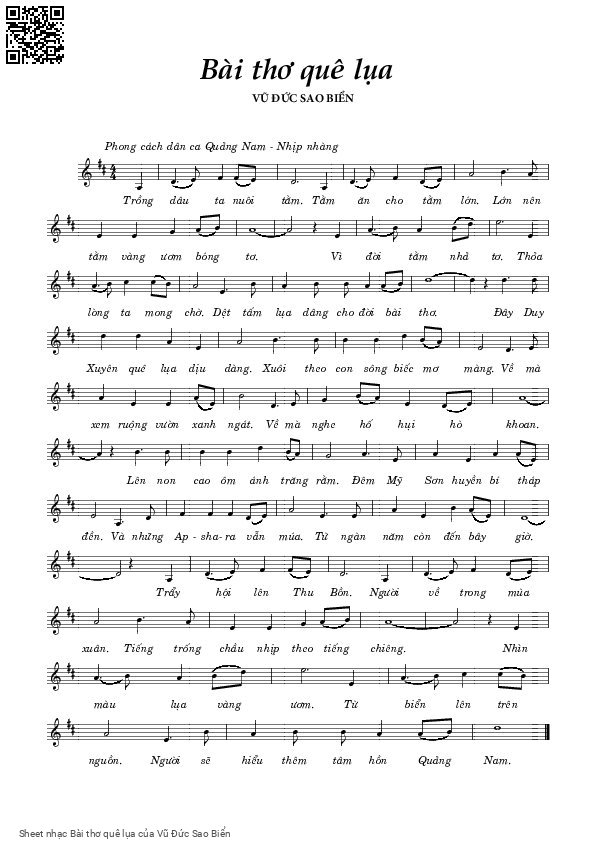 Transposition is the process of moving a song's melody and chords up or down in pitch by a constant interval. The direction of the transposition tool is indicated by a plus (+) sign for up and a minus (-) sign for down. Hover mouse over chords signs to see the chords chart of Bài thơ quê lụa song.