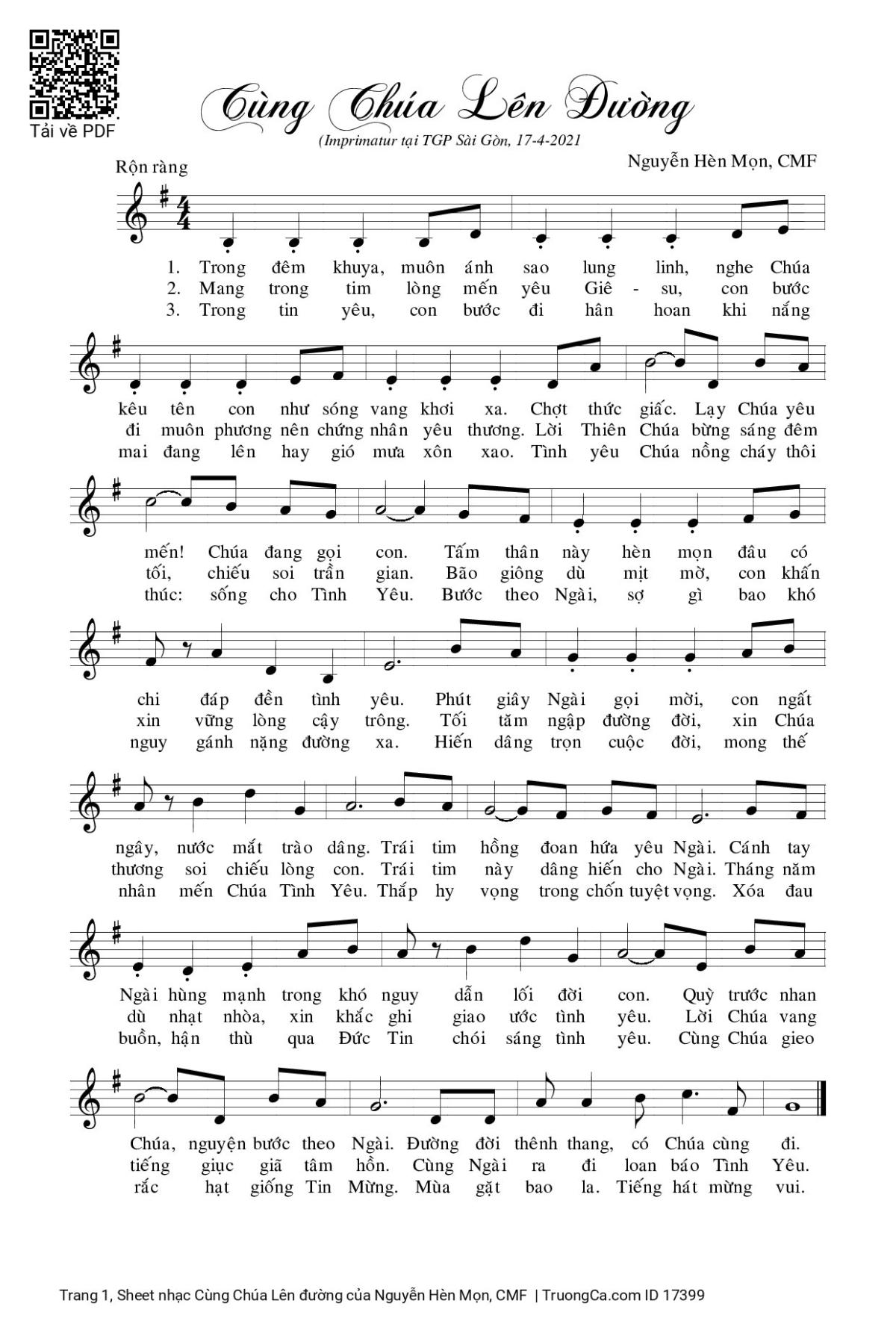 Transposition is the process of moving a song's melody and chords up or down in pitch by a constant interval. The direction of the transposition tool is indicated by a plus (+) sign for up and a minus (-) sign for down. Hover mouse over chords signs to see the chords chart of Cùng Chúa Lên đường song.