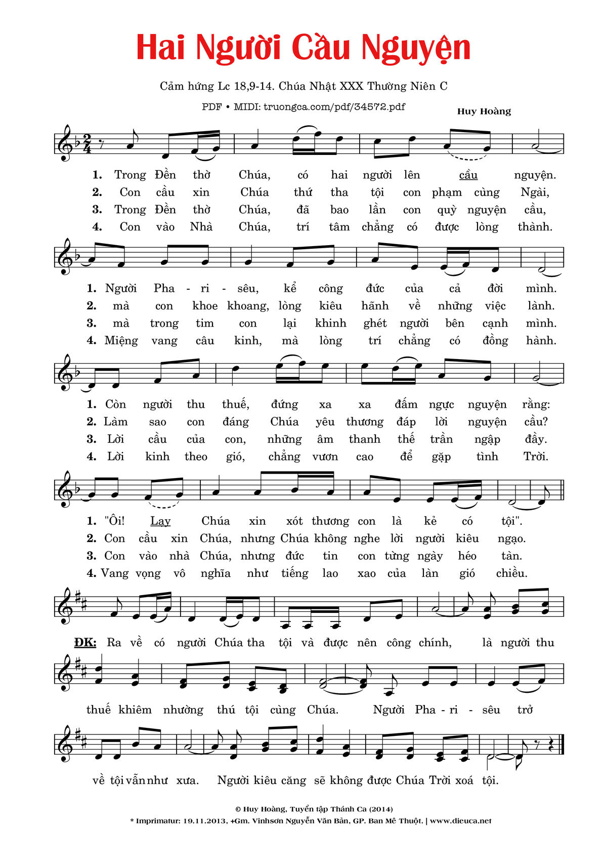1. Trong Đền thờ Chúa, có hai người lên cầu nguyện. Người Pha-ri-sêu, kể công đức của cả đời mình. Còn người thu thuế, đứng xa xa đấm ngực nguyện rằng: "Ôi! Lạy Chúa xin xót thương con là kẻ có tội". \nĐiệp khúc: Ra về có người Chúa tha tội và được nên công chính, là người thu thuế khiêm nhường thú tội cùng Chúa. Người Pha-ri-sêu trở về tội vẫn như xưa. Người kiêu căng sẽ không được Chúa Trời xoá tội. \n2. Con cầu xin Chúa thứ tha tội con phạm cùng Ngài, mà con khoe khoang, lòng kiêu hãnh về những việc lành. Làm sao con đáng Chúa yêu thương đáp lời nguyện cầu? Con cầu xin Chúa, nhưng Chúa không nghe lời người kiêu ngạo. \n3. Trong Đền thờ Chúa, đã bao lần con quỳ nguyện cầu, mà trong tim con lại khinh ghét người bên cạnh mình. Lời cầu của con, những âm thanh thế trần ngập đầy. Con vào nhà Chúa, nhưng đức tin con từng ngày héo tàn. \n4. Con vào Nhà Chúa, trí tâm chẳng có được lòng thành. Miệng vang câu kinh, mà lòng trí chẳng có đồng hành. Lời kinh theo gió, chẳng vươn cao để gặp tình Trời. Vang vọng vô nghĩa như tiếng lao xao của làn gió chiều.\n-------------------------------------------------------------------------------- \n\n \n\n\n\n\n 🌾 Thông tin chuẩn nhận dùng trong phụng vụ Công Giáo: Imprimatur: 19.11.2013, +Gm. Vinhsơn Nguyễn Văn Bản, GP. Ban Mê Thuột.\n \n \n