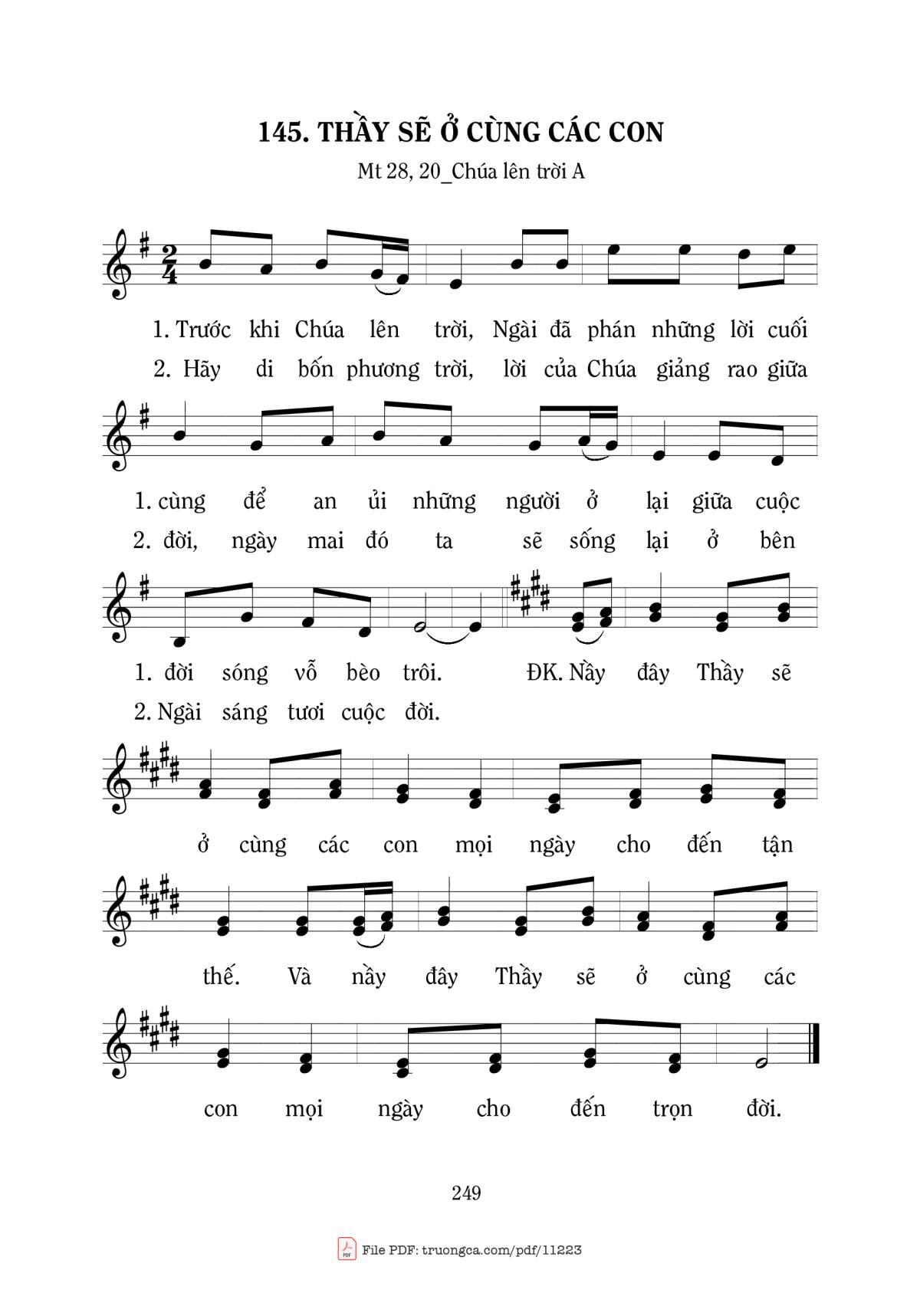 Điệp khúc: Này đây Thầy sẽ ở cùng các con mọi ngày cho đến tận thế và này đây Thầy sẽ ở cùng các con mọi ngày cho đến trọn đời.
