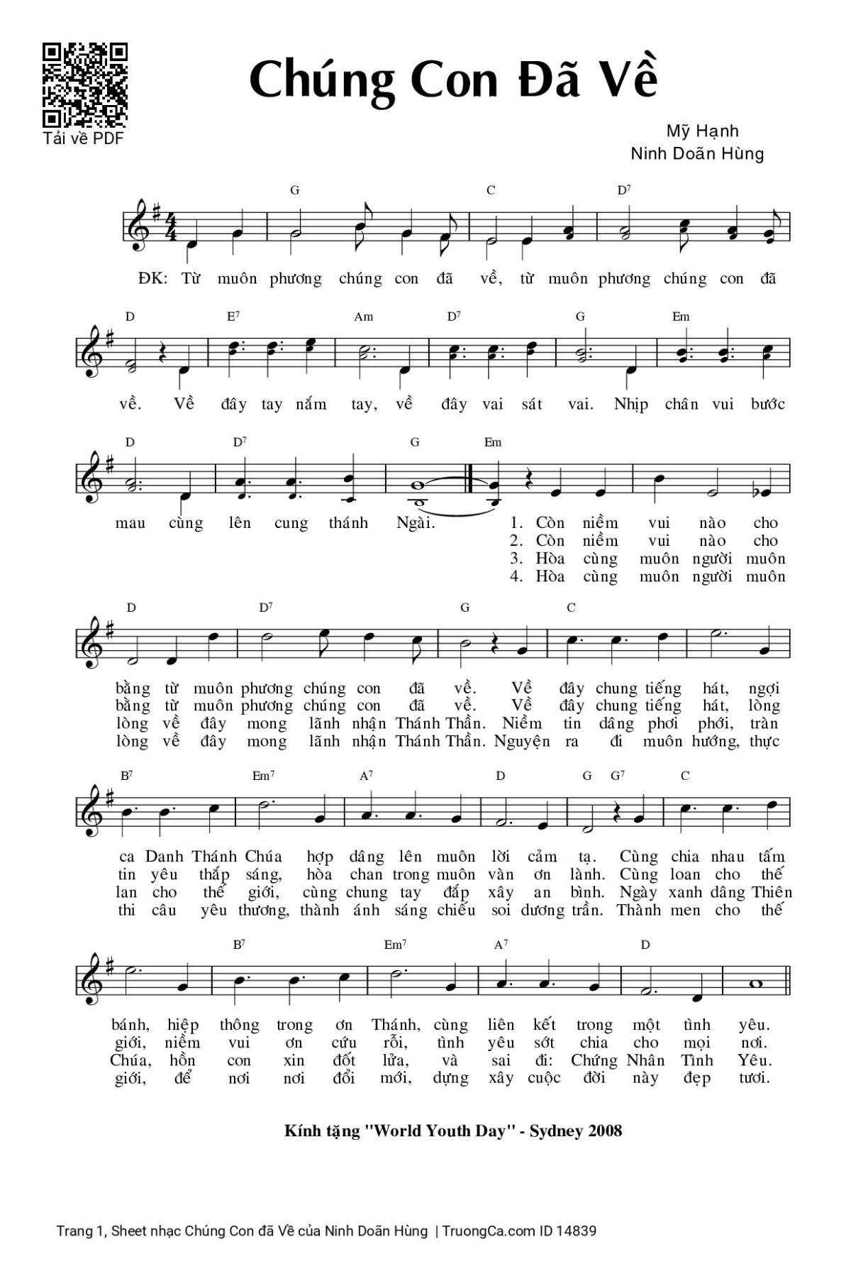 Transposition is the process of moving a song's melody and chords up or down in pitch by a constant interval. The direction of the transposition tool is indicated by a plus (+) sign for up and a minus (-) sign for down. Hover mouse over chords signs to see the chords chart of Chúng Con đã Về song.