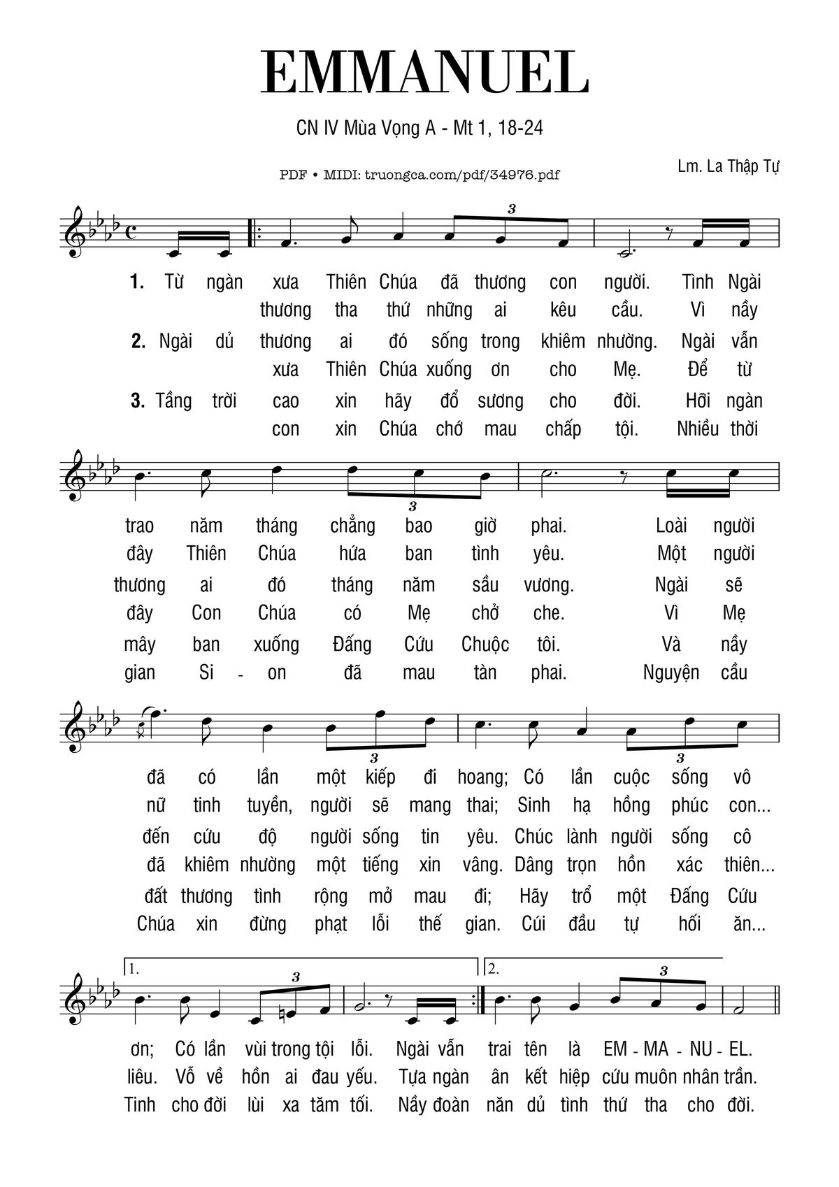 1. Từ ngàn xưa Thiên Chúa đã thương con người. Tình Ngài trao năm tháng chẳng bao giờ phai. Loài người đã có lần một kiếp đi hoang; Có lần cuộc sống vô ơn; Có lần vùi trong tội lỗi. Ngài vẫn thương tha thứ những ai kêu cầu. Vì nầy đây Thiên Chúa hứa ban tình yêu. Một người nữ tinh tuyền, người sẽ mang thai; Sinh hạ hồng phúc con trai tên là EM-MA-NU-EL.