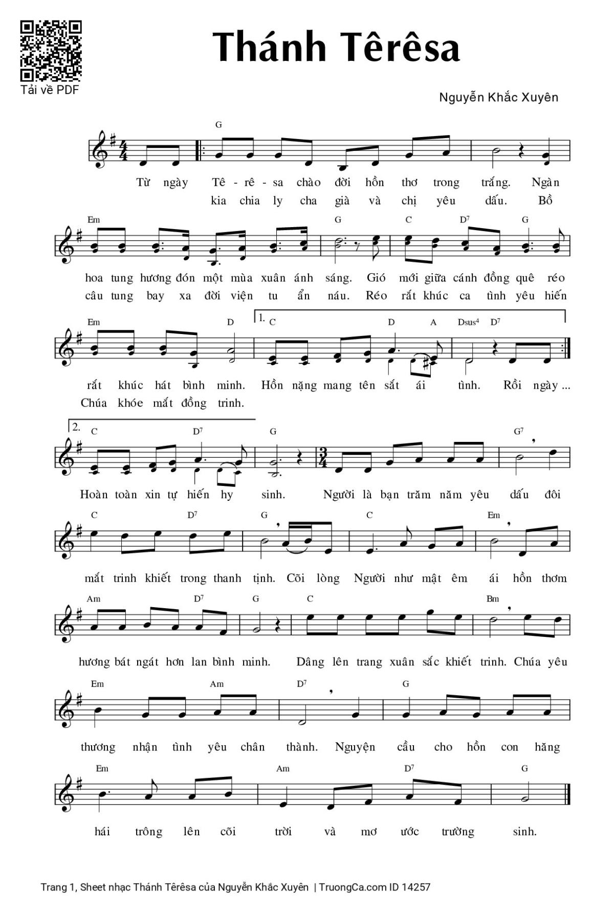 Transposition is the process of moving a song's melody and chords up or down in pitch by a constant interval. The direction of the transposition tool is indicated by a plus (+) sign for up and a minus (-) sign for down. Hover mouse over chords signs to see the chords chart of Thánh Têrêsa song.