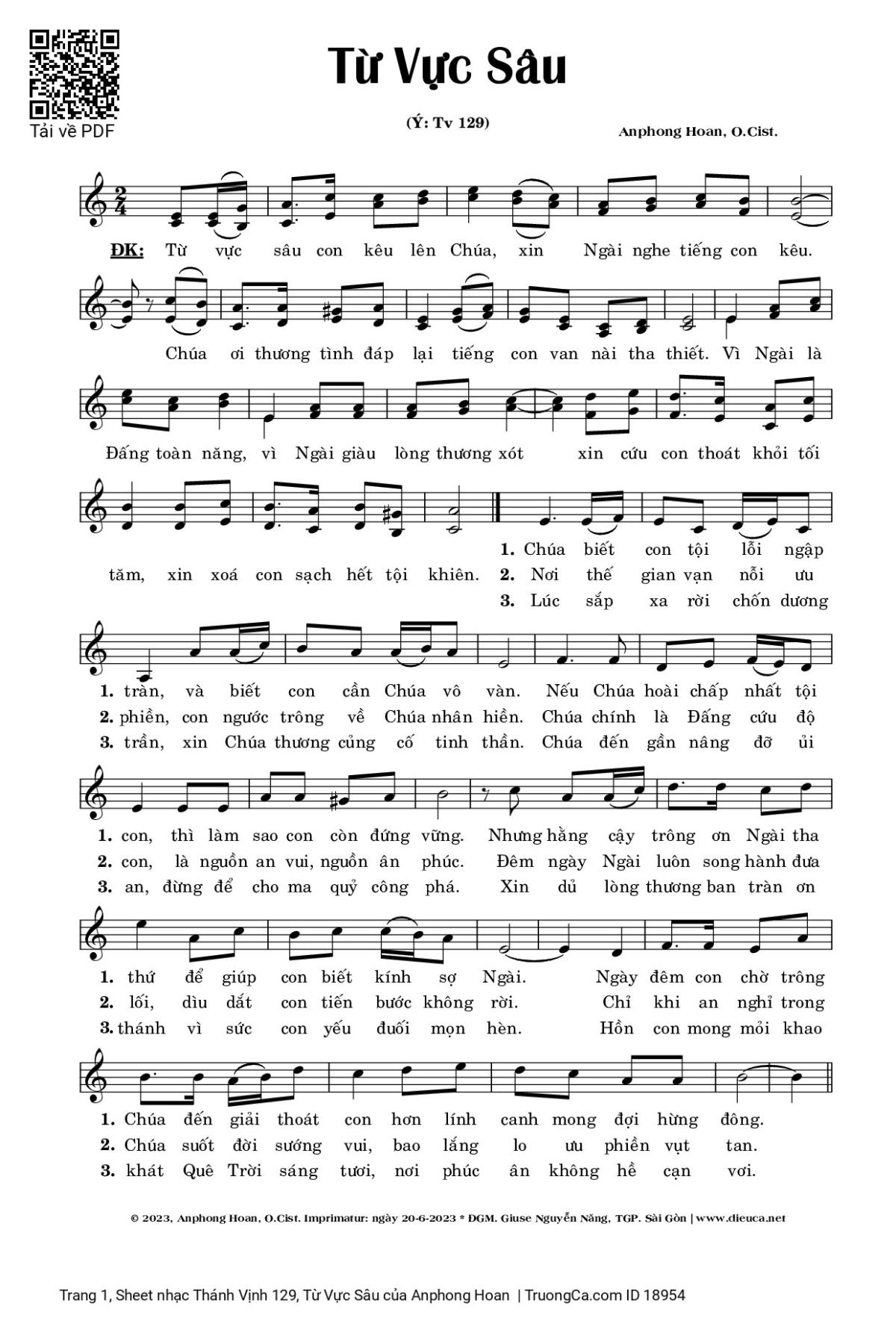 Điệp khúc: Từ vực sâu con kêu lên Chúa, xin Ngài nghe tiếng con kêu. Chúa ơi thương tình đáp lại tiếng con van nài tha thiết. Vì Ngài là Đấng toàn năng, vì Ngài giàu lòng thương xót xin cứu con thoát khỏi tối tăm, xin xoá con sạch hết tội khiên.