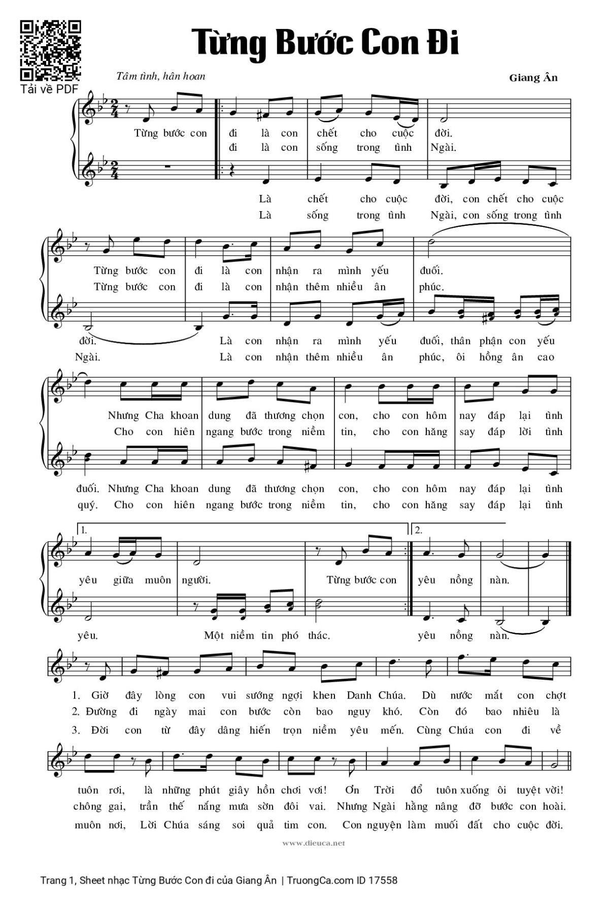 Điệp khúc: Từng bước con đi là con chết cho cuộc đời. Từng bước con đi là con nhận ra mình yếu đuối. Nhưng Cha khoan dung đã thương chọn con, cho con hôm nay đáp lại tình yêu giữa muôn người (một niêm tin phó thác). Từng bước con đi là con sống trong tình Ngài. Từng bước con đi là con nhận thêm nhiều ân phúc. Cho con hiên ngang bước trong niềm tin, cho con hăng say đáp lời tình yêu nồng nàn.