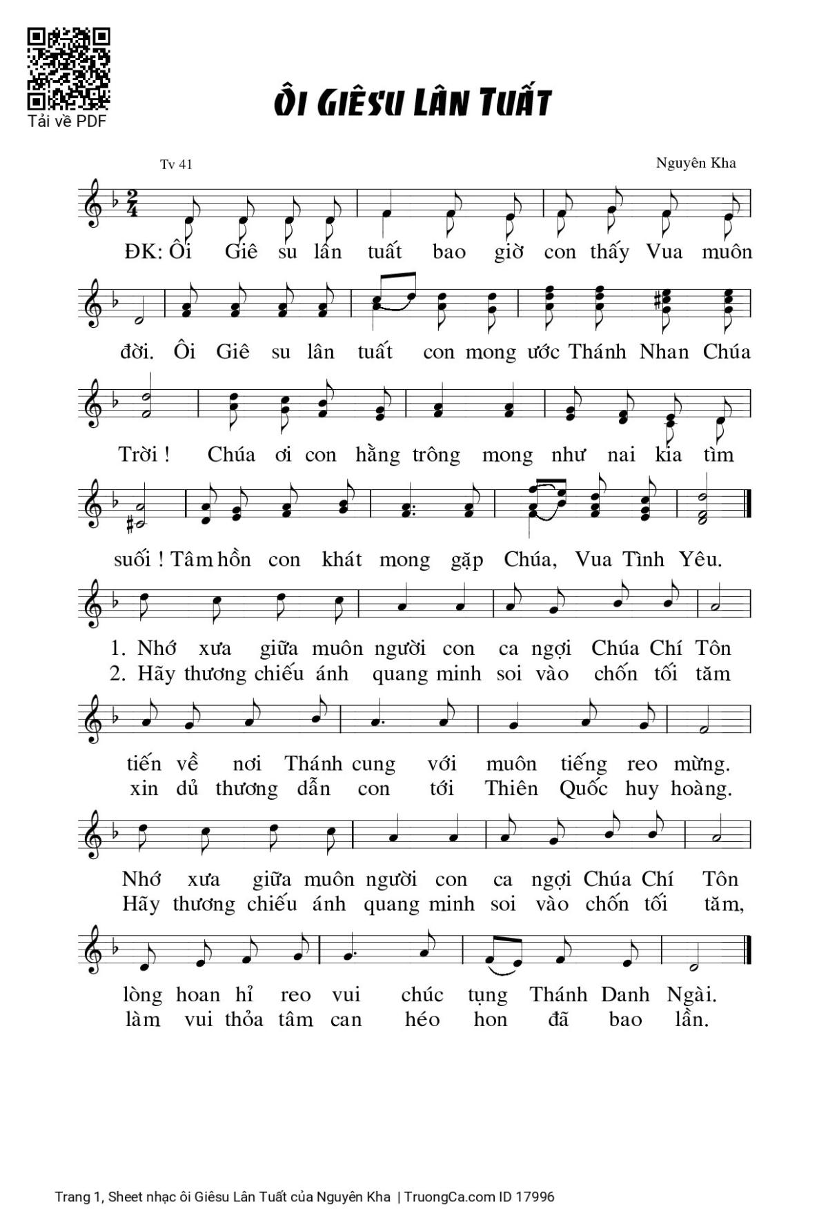 Điệp khúc. Ôi Giê su lân tuất bao giờ con thấy Vua muôn đời. Ôi Giê su lân tuất con mong ước Thánh Nhan Chúa Trời! Chúa ơi con hằng trông mong như nai kia tìm suối! Tâm hồn con khát mong gặp Chúa, Vua Tình Yêu.