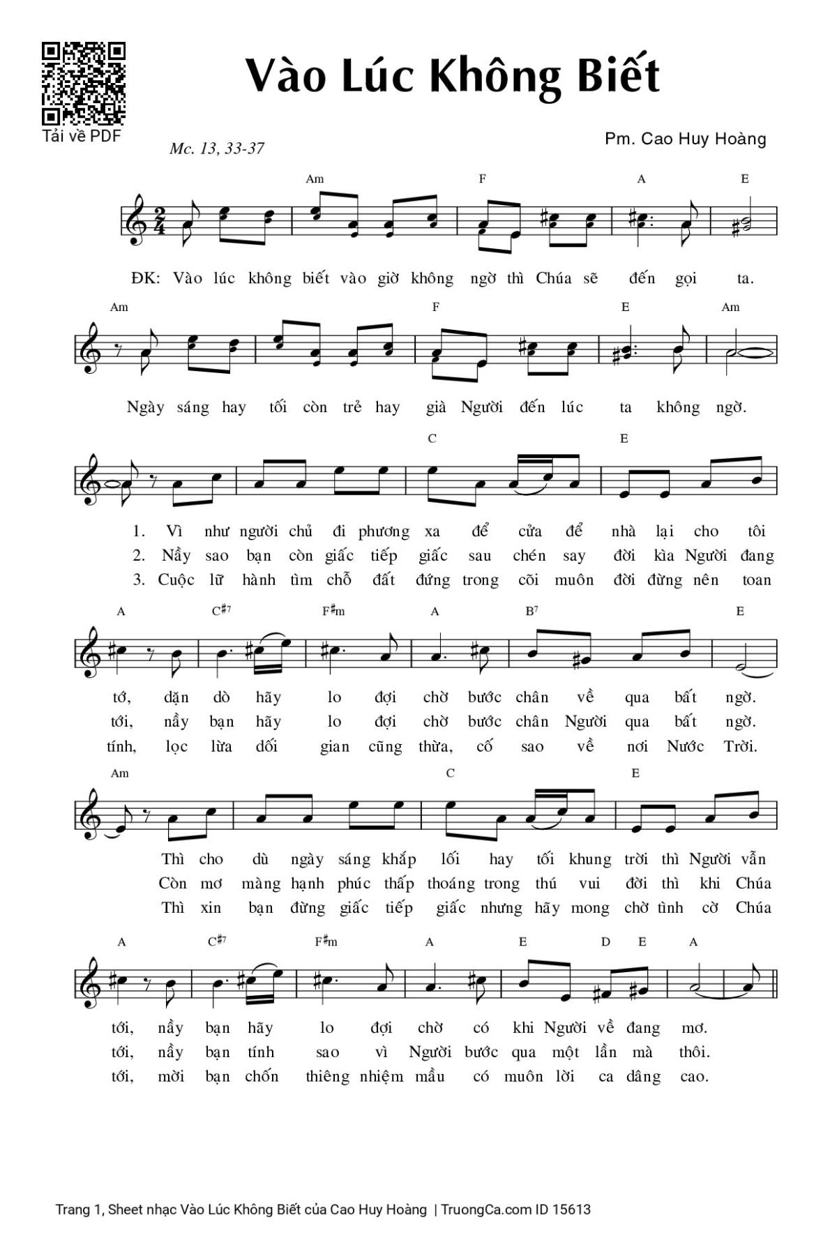Điệp khúc. Vào lúc không biết vào giờ không ngờ thì Chúa sẽ đến gọi ta. Ngày sáng hay tối còn trẻ hay già Người đến lúc ta không ngờ.