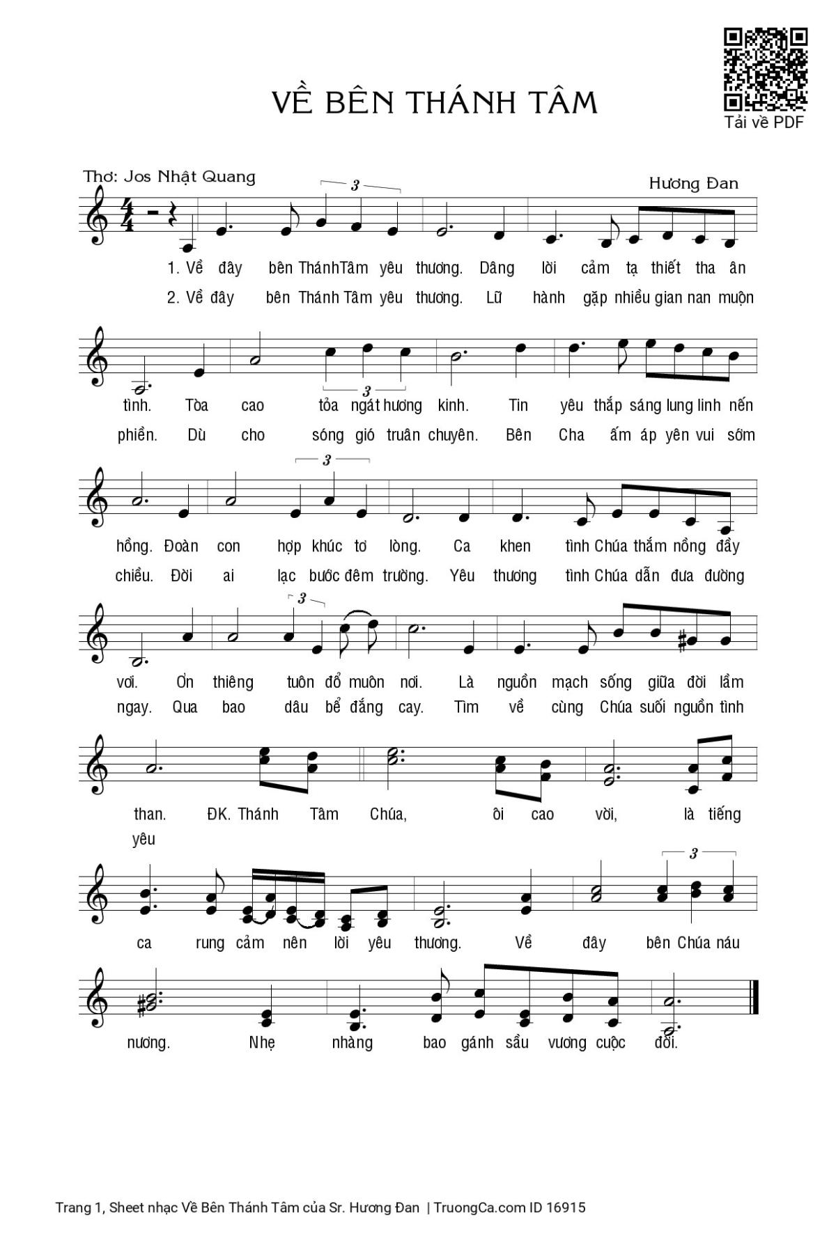 1. Về đây bên Thánh Tâm yêu thương. Dâng lời cảm tạ thiết tha ân tình. Tòa cao tỏa ngát hương kinh. Tin yêu thắp sáng lung linh nắng hồng. Đoàn con hợp khúc tơ lòng. Ca khen tình Chúa thắm nồng đầy vơi. Ơn thiêng tuôn đổ muôn nơi. Là nguồn mạch sống giữa đời lầm than.