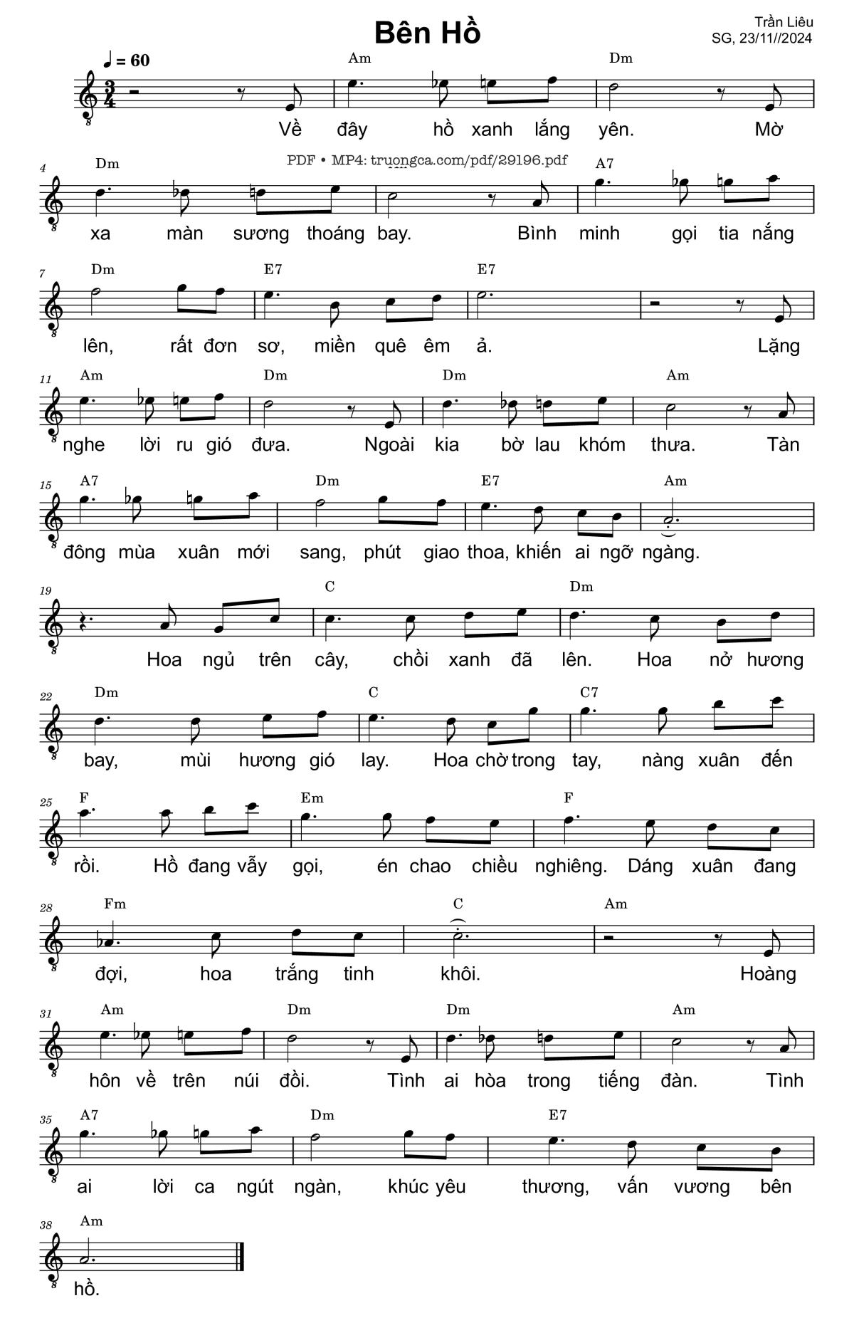 Trần Liêu Về đây hồ xanh lắng yên Mờ xa màn sương thoáng bay [PDF] [Sheet] [Lyrics] [Mp4/Midi]