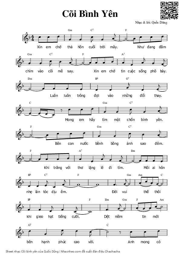 Transposition is the process of moving a song's melody and chords up or down in pitch by a constant interval. The direction of the transposition tool is indicated by a plus (+) sign for up and a minus (-) sign for down. Hover mouse over chords signs to see the chords chart of Cõi bình yên song.