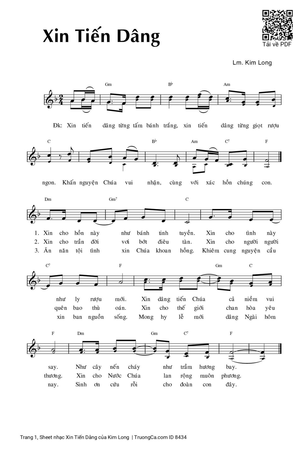 Transposition is the process of moving a song's melody and chords up or down in pitch by a constant interval. The direction of the transposition tool is indicated by a plus (+) sign for up and a minus (-) sign for down. Hover mouse over chords signs to see the chords chart of Xin Tiến Dâng song.
