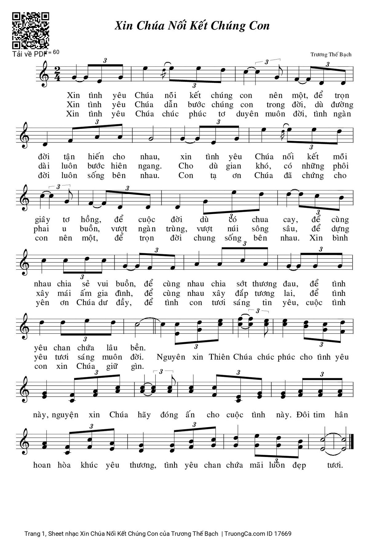 3. Xin tình yêu Chúa chúc phúc tơ duyên muôn đời, tình ngàn đời luôn sống bên nhau. Con tạ ơn Chúa đã chứng cho con nên một, để trọn đời chung sống bên nhau. Xin bình yên ơn Chúa dư đầy, để tình con tươi sáng tin yêu, cuộc tình con xin Chúa giữ gìn.