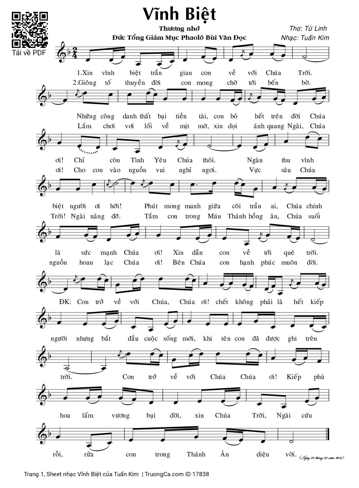 1/ Xin vĩnh biệt trần gian con về với Chúa Trời. Những công danh thất bại tiền tài, con bỏ hết trên đời Chúa ơi! Chỉ còn Tình Yêu Chúa thôi. Ngàn thu vĩnh biệt người ơi hỡi! Phút mong manh giữa cõi trần ai, Chúa chính là sức mạnh Chúa ơi! Xin dẫn con về tới quê trời.