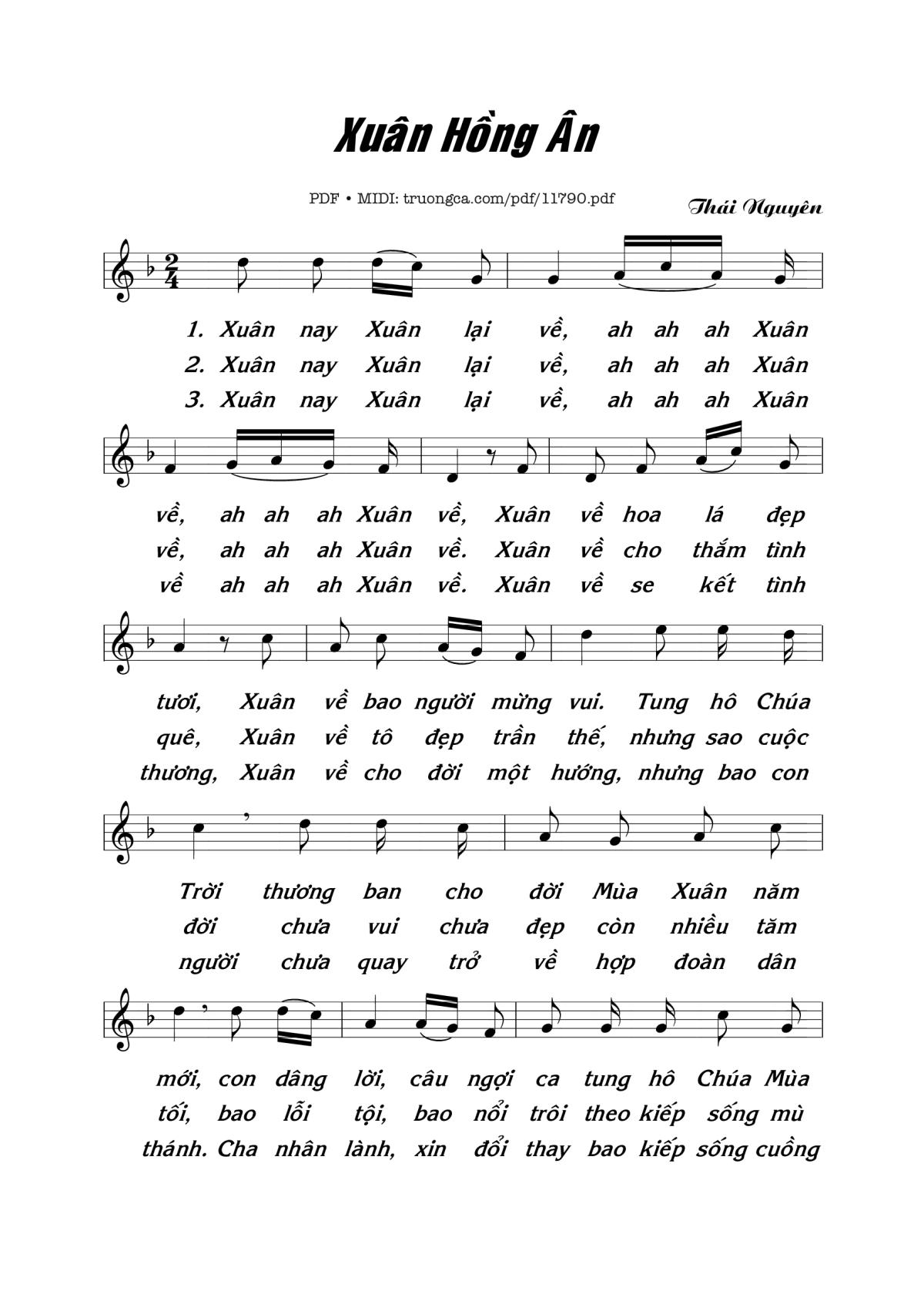 Điệp khúc. Dâng lên niềm tri ân, dâng lên lòng tin mến. Con ca ngợi Thiên Chúa, Chúa Xuân muôn đời. Xin thương đời lầm than, ban ơn chan hòa khắp chốn. Cho mọi người nhận biết Chúa là Mùa Xuân.
