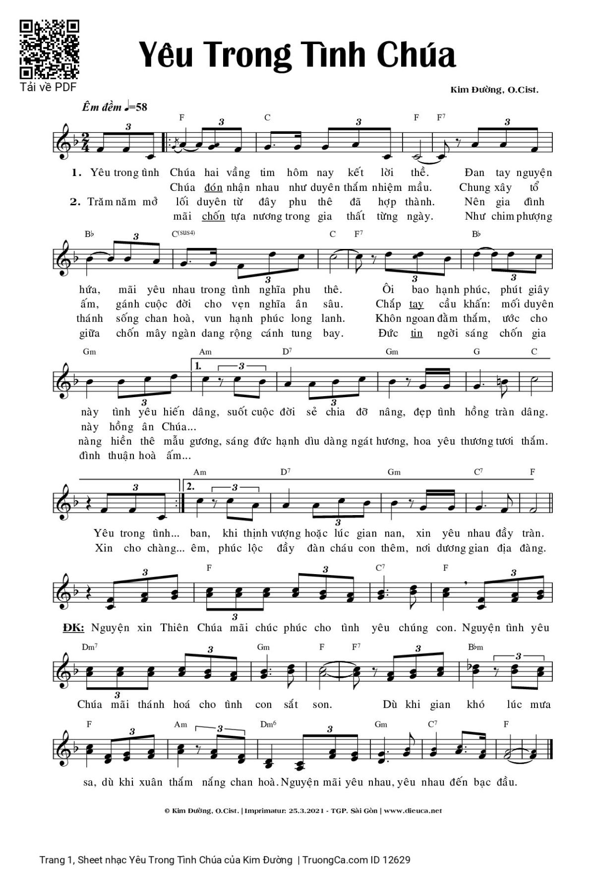 1. Yêu trong tình Chúa hai vầng tim hôm nay kết lời thề. Đan tay nguyện hứa, mãi yêu nhau trong tình nghĩa phu thê. Ôi bao hạnh phúc, phút giây này tình yêu hiến dâng, suốt cuộc đời sẻ chia đỡ nâng, đẹp tình hồng tràn dâng. Yêu trong tình Chúa đón nhận nhau như duyên thắm nhiệm mầu. Chung xây tổ ấm, gánh cuộc đời cho vẹn nghĩa ân sâu. Chắp tay cầu khấn: mối duyên này hồng ân Chúa ban, khi thịnh vượng hoặc lúc gian nan, xin yêu nhau đầy tràn.